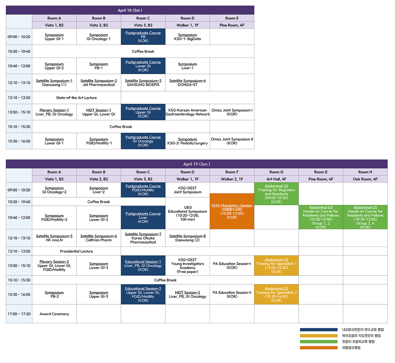 | Room C | 09:00-10:20 | PG Course - Pancreatobiliary | Room C | 09:00-10:20 | PG Course - FGID/Motility | |